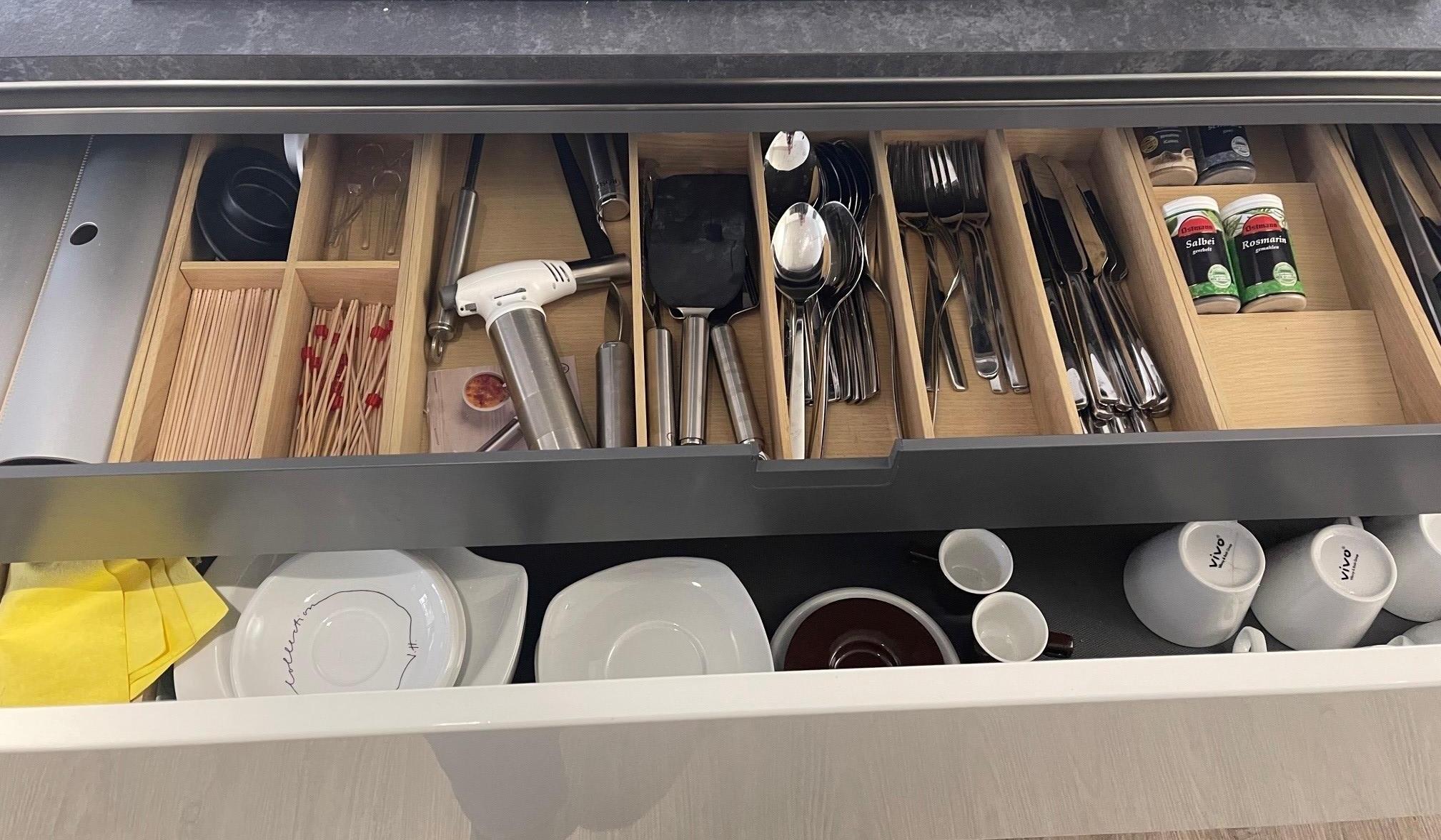 120 cm Kochstellenschrank Übertief 71 cm mit Innenschubkasten und 2x Auszügen. Passender Eiche Massivholz Besteckschubkasten